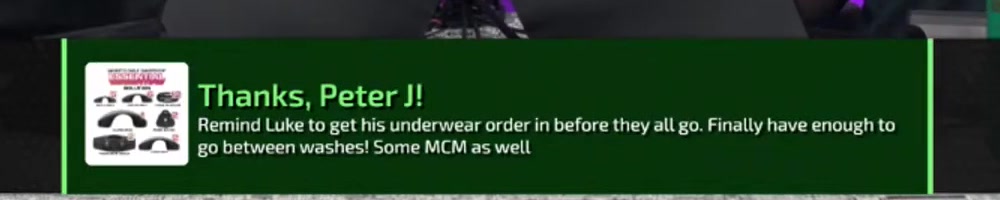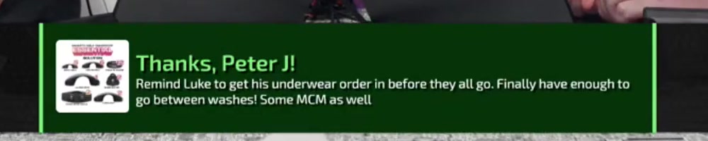 Peter J message Thanks, Peter J! Remind Luke to get his underwear order in before they all go. Finally have enough to go between washes! Some MCM as well Timestamp