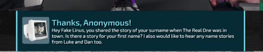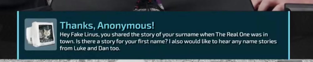 Anonymous message Thanks, Anonymous! Hey Fake Linus, you shared the story of your surname when The Real One was in town. Is there a story for your first name? I also would like to hear any name stories from Luke and Dan too. Timestamp