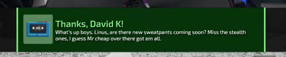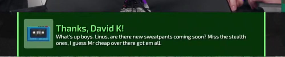 David K message Thanks, David K! What's up boys. Linus, are there new sweatpants coming soon? Miss the stealth ones, I guess Mr cheap over there got em all. Timestamp