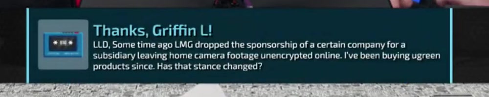 Griffin L message Thanks, Griffin L! LLD, Some time ago LMG dropped the sponsorship of a certain company for a subsidiary leaving home camera footage unencrypted online. I've been buying ugreen products since. Has that stance changed? Timestamp