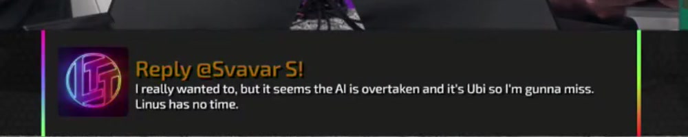 Svavar S reply Reply @Svavar S! I really wanted to, but it seems the Al is overtaken and it's Ubi so I'm gunna miss. Linus has no time. Timestamp