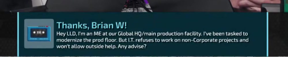 Brian W message Thanks, Brian W! Hey LLD, I'm an ME at our Global HQ/main production facility. I've been tasked to modernize the prod floor. But I.T. refuses to work on non-Corporate projects and won't allow outside help. Any advise? Timestamp