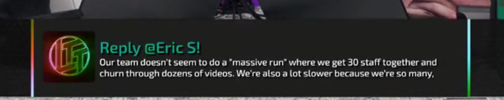 Eric S reply Reply @Eric S! Our team doesn't seem to do a "massive run" where we get 30 staff together and churn through dozens of videos. We're also a lot slower because we're so many, Timestamp