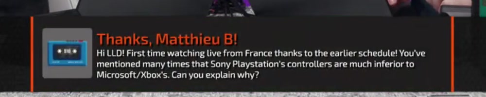 Matthieu B message Thanks, Matthieu B! Hi LLD! First time watching live from France thanks to the earlier schedule! You've mentioned many times that Sony Playstation's controllers are much inferior to Microsoft/Xbox's. Can you explain why? Timestamp