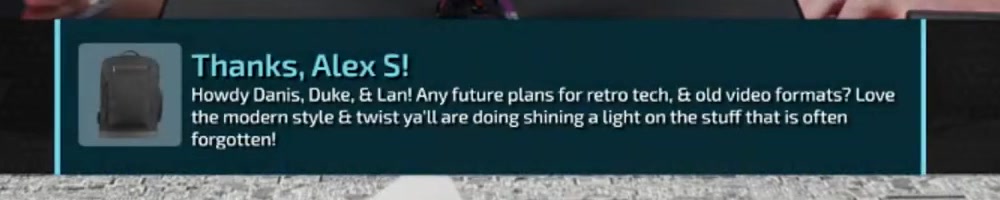 Alex S message Thanks, Alex S! Howdy Danis, Duke, & Lan! Any future plans for retro tech, & old video formats? Love the modern style & twist ya'll are doing shining a light on the stuff that is often forgotten! Timestamp