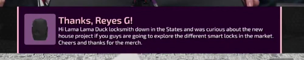 Reyes G message Thanks, Reyes G! Hi Lama Lama Duck locksmith down in the States and was curious about the new house project if you guys are going to explore the different smart locks in the market. Cheers and thanks for the merch. Timestamp