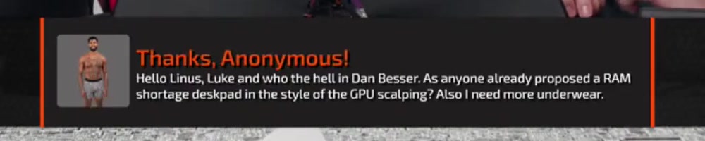 Anonymous message Thanks, Anonymous! Hello Linus, Luke and who the hell in Dan Besser. As anyone already proposed a RAM shortage deskpad in the style of the GPU scalping? Also I need more underwear. Timestamp