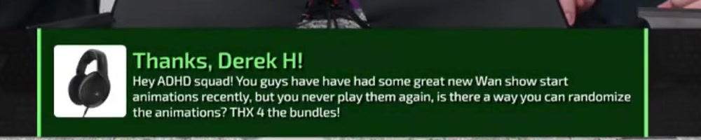 Derek H message Thanks, Derek H! Hey ADHD squad! You guys have have had some great new Wan show start animations recently, but you never play them again, is there a way you can randomize the animations? THX 4 the bundles! Timestamp
