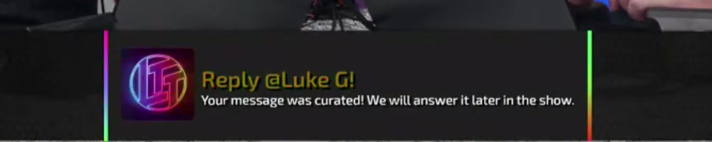 Luke G reply Reply @Luke G! Your message was curated! We will answer it later in the show. Timestamp