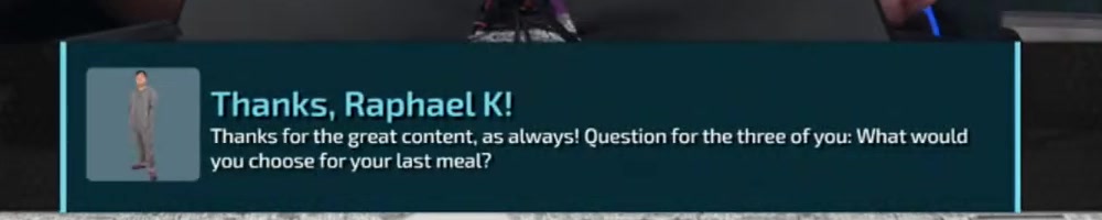 Raphael K message Thanks, Raphael K! Thanks for the great content, as always! Question for the three of you: What would you choose for your last meal? Timestamp