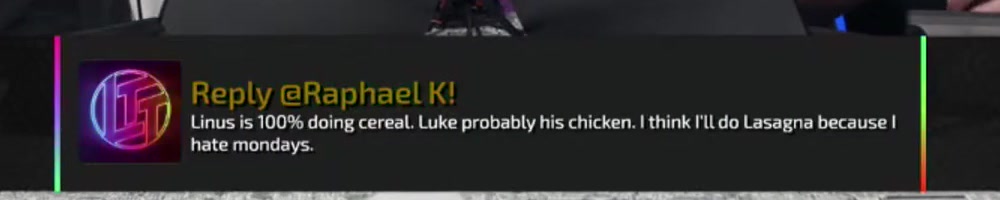 Raphael K reply Reply @Raphael K! Linus is 100% doing cereal. Luke probably his chicken. I think I'll do Lasagna because I hate mondays. Timestamp