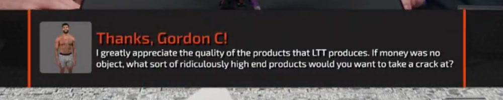 Gordon C message Thanks, Gordon C! I greatly appreciate the quality of the products that LTT produces. If money was no object, what sort of ridiculously high end products would you want to take a crack at? Timestamp