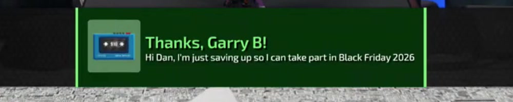 Garry B message Thanks, Garry B! Hi Dan, I'm just saving up so I can take part in Black Friday 2026 Timestamp