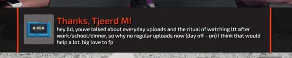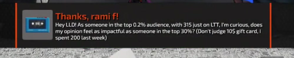 rami f message Thanks, rami f! Hey LLD! As someone in the top 0.2% audience, with 315 just on LTT, I'm curious, does my opinion feel as impactful as someone in the top 30%? (Don't judge 10$ gift card, I spent 200 last week) Timestamp
