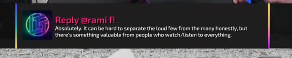 rami f reply Reply @rami f! Absolutely. It can be hard to separate the loud few from the many honestly, but there's something valuable from people who watch/listen to everything. Timestamp