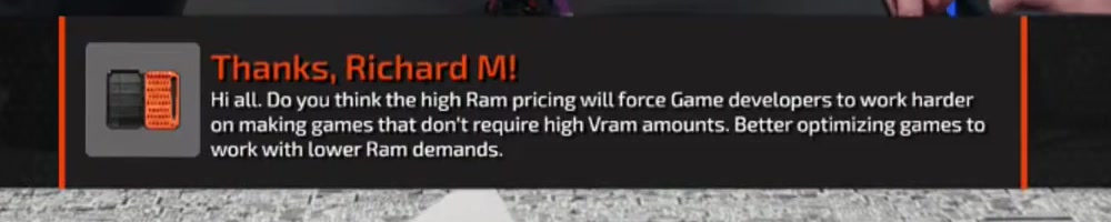 Richard M message Thanks, Richard M! Hi all. Do you think the high Ram pricing will force Game developers to work harder on making games that don't require high Vram amounts. Better optimizing games to work with lower Ram demands. Timestamp
