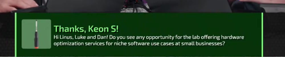 Keon S message Thanks, Keon S! Hi Linus, Luke and Dan! Do you see any opportunity for the lab offering hardware optimization services for niche software use cases at small businesses? Timestamp