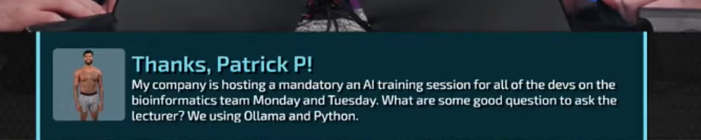 Patrick P message Thanks, Patrick P! My company is hosting a mandatory an Al training session for all of the devs on the bioinformatics team Monday and Tuesday. What are some good question to ask the lecturer? We using Ollama and Python. Timestamp