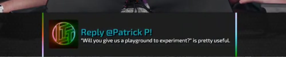 Patrick P reply Reply @Patrick P! "Will you give us a playground to experiment?" is pretty useful. Timestamp