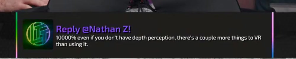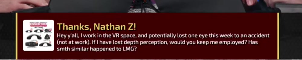 Nathan Z message Thanks, Nathan Z! Hey y'all, I work in the VR space, and potentially lost one eye this week to an accident (not at work). If I have lost depth perception, would you keep me employed? Has smth similar happened to LMG? Timestamp