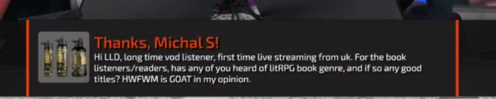 Michal S message Thanks, Michal S! Hi LLD, long time vod listener, first time live streaming from uk. For the book listeners/readers, has any of you heard of litRPG book genre, and if so any good titles? HWFWM is GOAT in my opinion. Timestamp