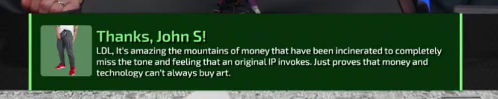 John S message Thanks, John S! LDL, It's amazing the mountains of money that have been incinerated to completely miss the tone and feeling that an original IP invokes. Just proves that money and technology can't always buy art. Timestamp