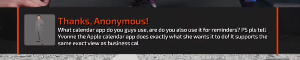 Anonymous message Thanks, Anonymous! What calendar app do you guys use, are do you also use it for reminders? PS pls tell Yvonne the Apple calendar app does exactly what she wants it to do! It supports the same exact view as business cal Timestamp