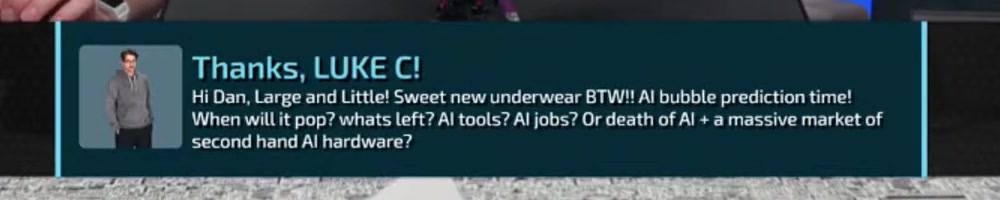 LUKE C message Thanks, LUKE C! Hi Dan, Large and Little! Sweet new underwear BTW!! Al bubble prediction time! When will it pop? whats left? Al tools? Al jobs? Or death of Al + a massive market of second hand Al hardware? Timestamp