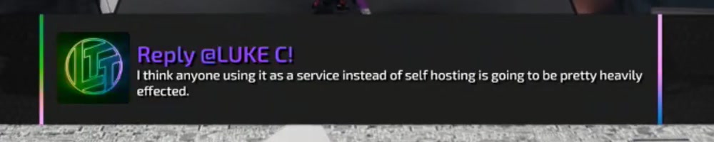 LUKE C reply Reply @LUKE C! I think anyone using it as a service instead of self hosting is going to be pretty heavily effected. Timestamp