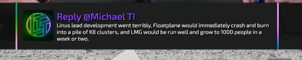 Michael T reply Reply @Michael T! Linus lead development went terribly, Floatplane would immediately crash and burn into a pile of K8 clusters, and LMG would be run well and grow to 1000 people in a week or two. Timestamp