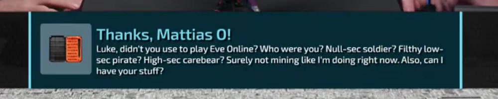 Mattias O message Thanks, Mattias O! Luke, didn't you use to play Eve Online? Who were you? Null-sec soldier? Filthy low- sec pirate? High-sec carebear? Surely not mining like I'm doing right now. Also, can I have your stuff? Timestamp