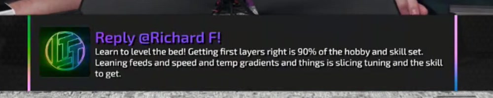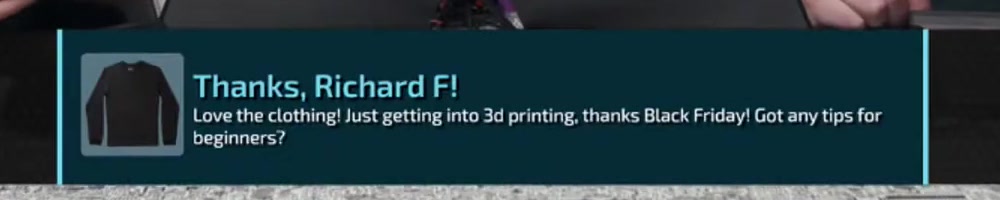 Richard F message Thanks, Richard F! Love the clothing! Just getting into 3d printing, thanks Black Friday! Got any tips for beginners? Timestamp