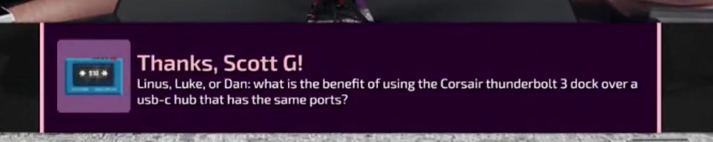 Scott G message Thanks, Scott G! Linus, Luke, or Dan: what is the benefit of using the Corsair thunderbolt 3 dock over a usb-c hub that has the same ports? Timestamp