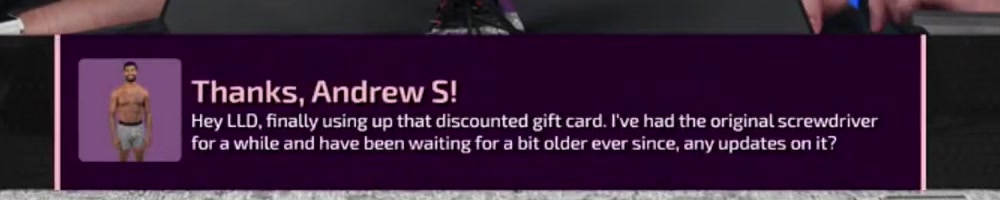 Andrew S message Thanks, Andrew S! Hey LLD, finally using up that discounted gift card. I've had the original screwdriver for a while and have been waiting for a bit older ever since, any updates on it? Timestamp