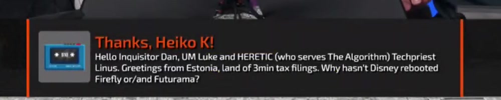 Heiko K message Thanks, Heiko K! Hello Inquisitor Dan, UM Luke and HERETIC (who serves The Algorithm) Techpriest Linus. Greetings from Estonia, land of 3min tax filings. Why hasn't Disney rebooted Firefly or/and Futurama? Timestamp