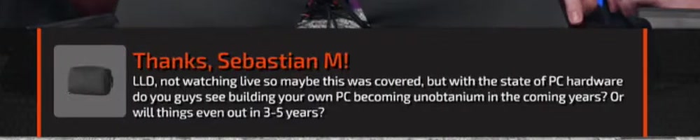 Sebastian M message Thanks, Sebastian M! LLD, not watching live so maybe this was covered, but with the state of PC hardware do you guys see building your own PC becoming unobtanium in the coming years? Or will things even out in 3-5 years? Timestamp
