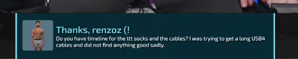 renzoz ( message Thanks, renzoz (! Do you have timeline for the ltt socks and the cables? I was trying to get a long USB4 cables and did not find anything good sadly. Timestamp