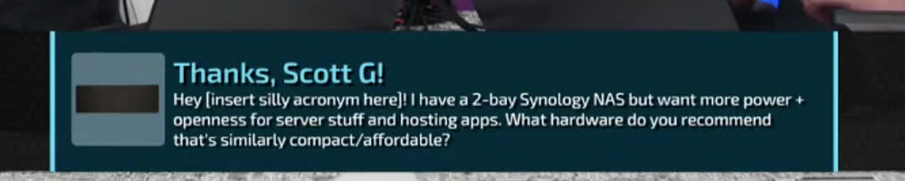 Scott G message Thanks, Scott G! Hey [insert silly acronym here]! I have a 2-bay Synology NAS but want more power + openness for server stuff and hosting apps. What hardware do you recommend that's similarly compact/affordable? Timestamp