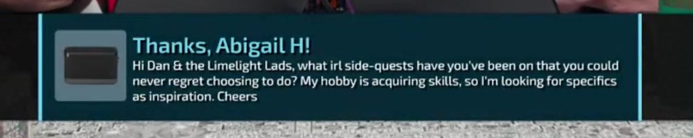 Hi Dan & the Limelight Lads, what irl side-quests have you've been on that you could