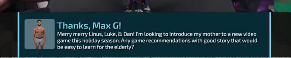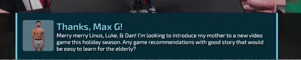 Merry merry Linus, Luke, & Dan! I'm looking to introduce my mother to a new video