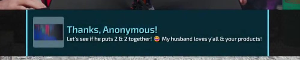 Let's see if he puts 2 & 2 together! My husband loves y'all & your products! | Timestamp |  |