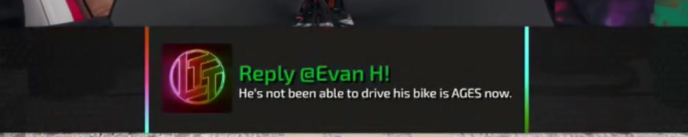 He's not been able to drive his bike is AGES now. | Timestamp |  |