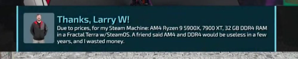 Due to prices, for my Steam Machine: AM4 Ryzen 9 5900X, 7900 XT, 32 GB DDR4 RAM