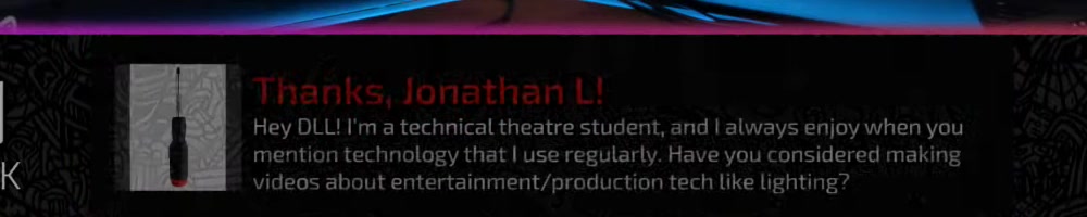 Hey DLL! I'm a technical theatre student, and I always enjoy when you