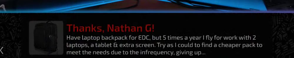 Have laptop backpack for EDC, but 5 times a year I fly for work with 2