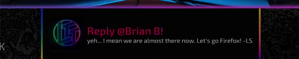 yeh... I mean we are almost there now. Let's go Firefox! -LS | Timestamp |  |