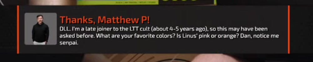 asked before. What are your favorite colors? Is Linus' pink or orange? Dan, notice me