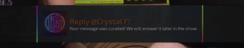 Your message was curated! We will answer it later in the show. | Timestamp |  |