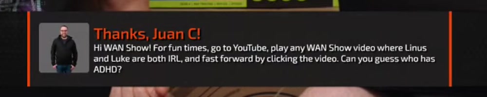 Hi WAN Show! For fun times, go to YouTube, play any WAN Show video where Linus
