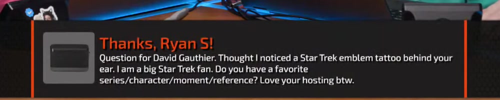 Question for David Gauthier. Thought I noticed a Star Trek emblem tattoo behind your